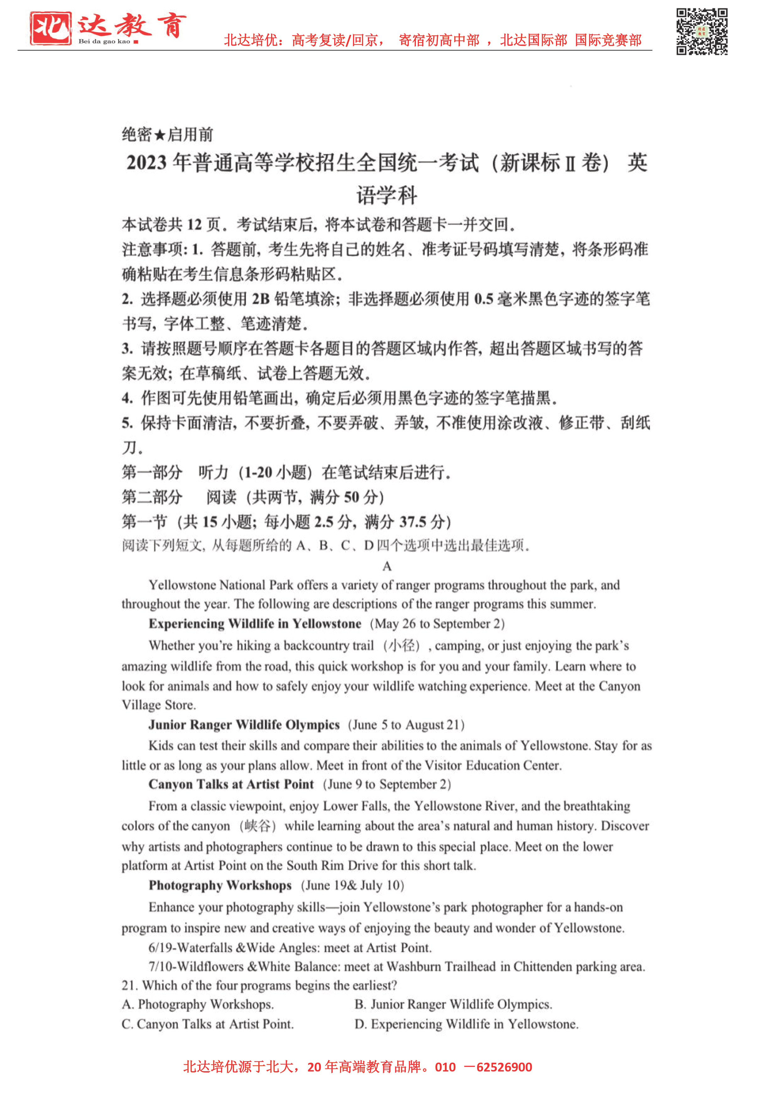 2023全国高考考试已结束,为了方便同学们查找高考试题答案进行估分,admw360复读学校整理了2023高考新课标II卷英语试题及答案,分享给同学们。详情如下: