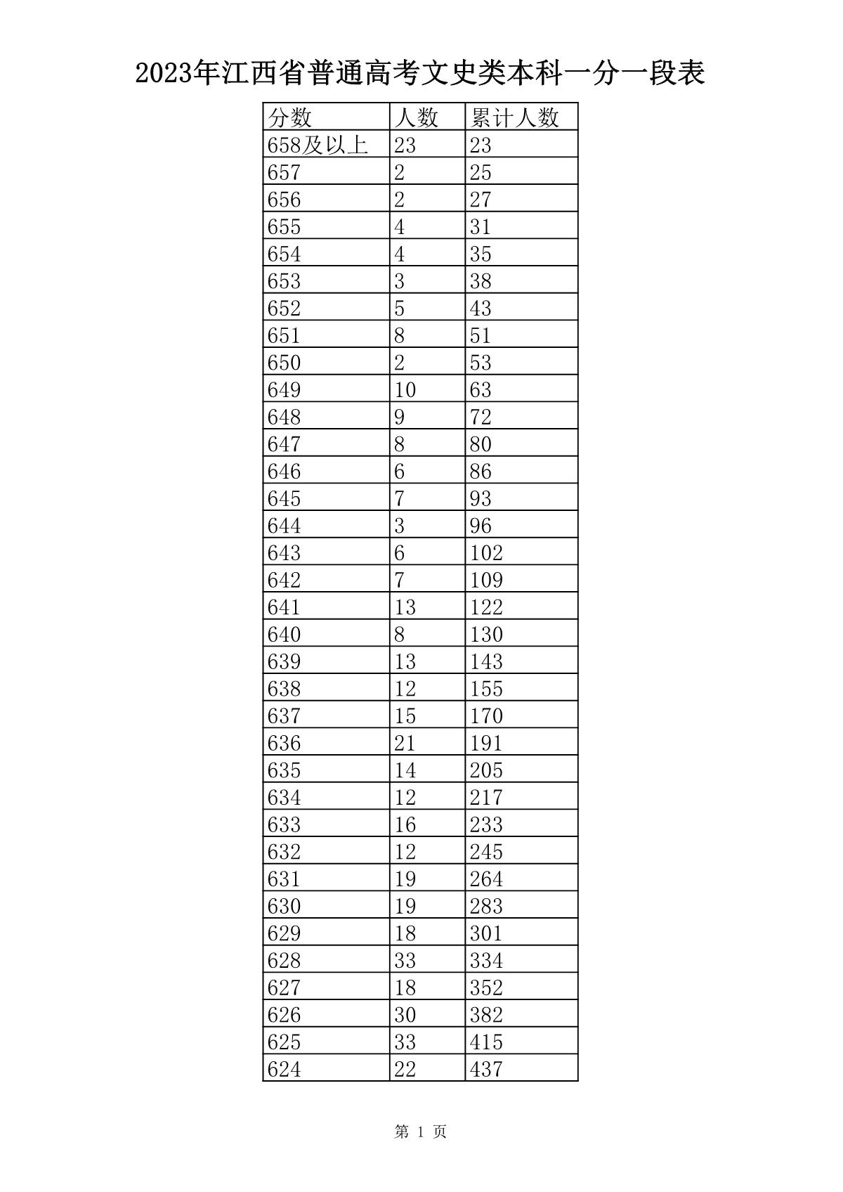 2023年江西高考文科成绩一分一段表