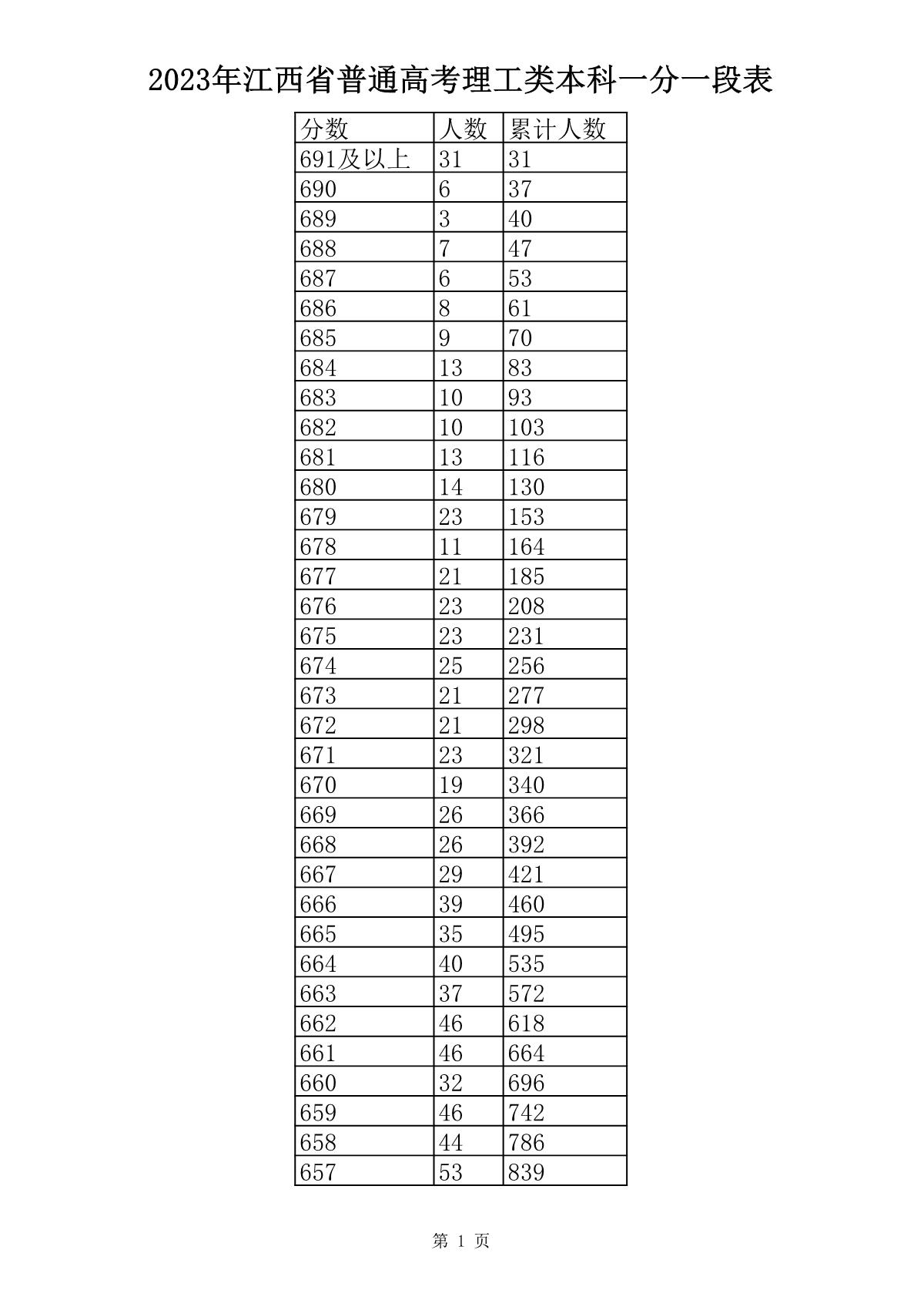 2023年江西高考理科成绩一分一段表