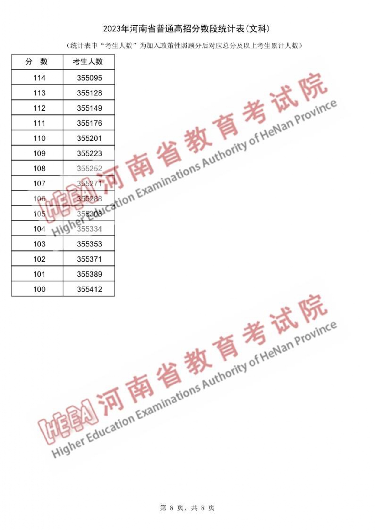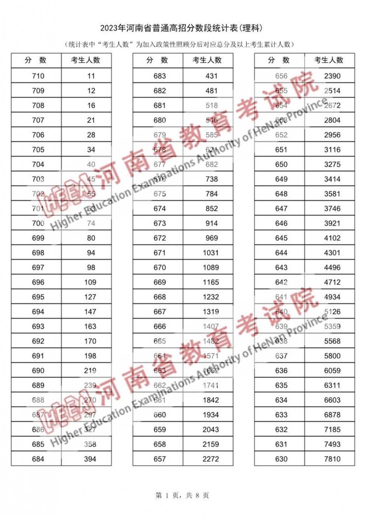 2023年河南省高考文理科类一分一段表