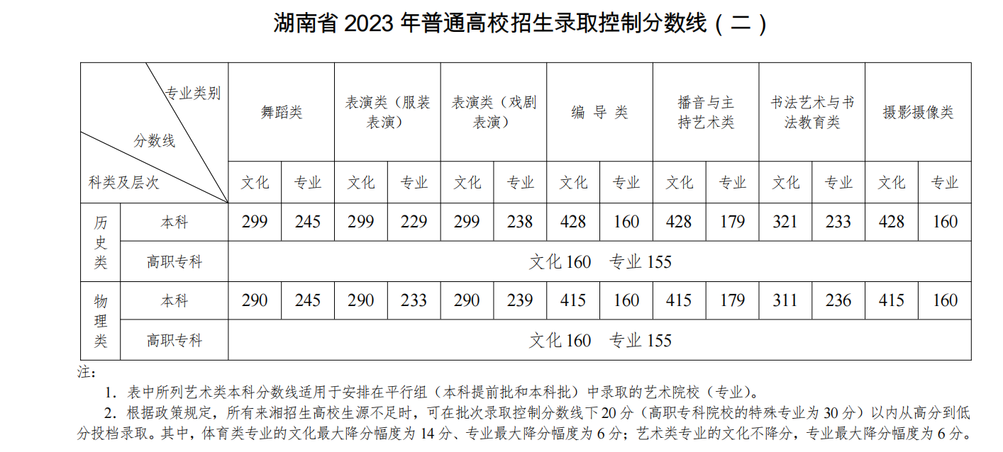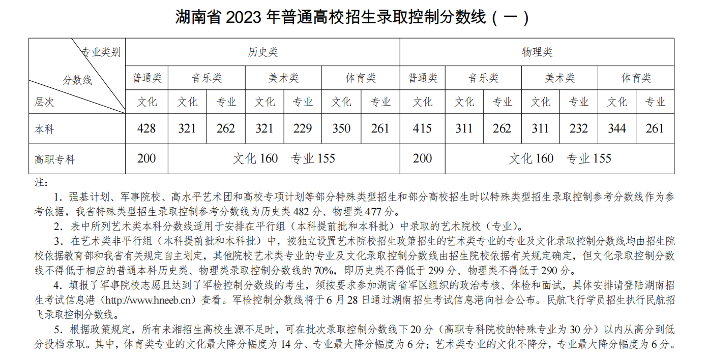 6月25日,湖南省教育考试院公布了今年各批次录取控制分数线。其中,历史类本科线为428分,专科线为200分;物理类本科线为415分,专科线为200分。此外,特殊类型招生录取控制分数线为历史类482分、物理类477分,该分数线将作为强基计划、军事院校、高水平艺术团和高校专项计划等部分特殊类型招生和部分高校招生时的参考依据。具体数据如下: