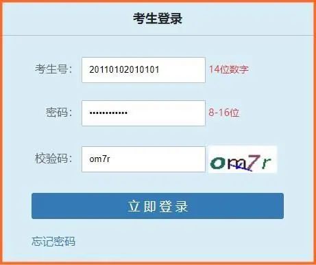 1.系统登录。填报前先进行登录。登录密码为高考报名时报名系统所用的密码。如考生忘记密码,可以点击“忘记密码”按照网页流程通过手机短信验证设置新密码(手机号为高考报名时填写的号码),或者联系本人所属报名单位申请重置密码。