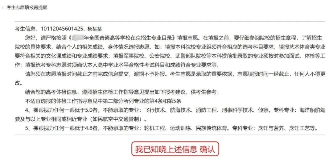 考生初次登录,将进入考生志愿填报再提醒页面(注:该页面仅在初次登录时显示),请考生再次核对个人信息,仔细阅读填报志愿注意事项,并点击“我已知晓上述信息 确认” 后进 入选择类型页面。