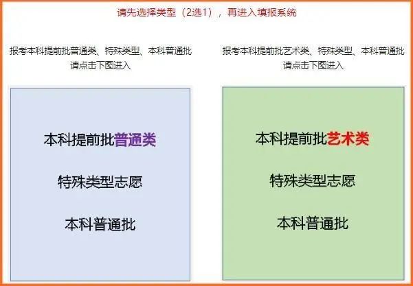 2.选择类型。登录系统后,需要根据本人意愿选择本科提前批类型。报考本科提前批普通类、特殊类型志愿、本科普通批,请点击左图;报考本科提前批艺术类、特殊类型志愿、本科普通批,请点击右图。两种类型只能选其中一种,如果选错了,在填报志愿页面中更改。