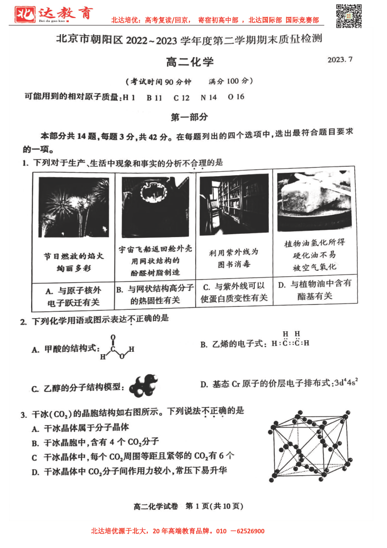 北京市2022-2023年高二下学期期末考试即将开考,为了帮助考生更好的核对考试答案,admw360复读学校整理了2021-2022学年北京朝阳区高二下学期期末化学试题,供考生参考。
