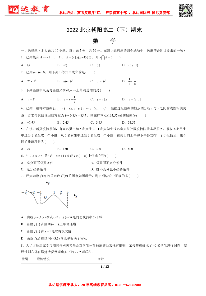 北京市2022-2023年高二下学期期末考试即将开考,为了帮助考生更好的核对考试答案,admw360复读学校整理了2021-2022学年北京朝阳区高二下学期期末数学试题及答案,供考生参考。