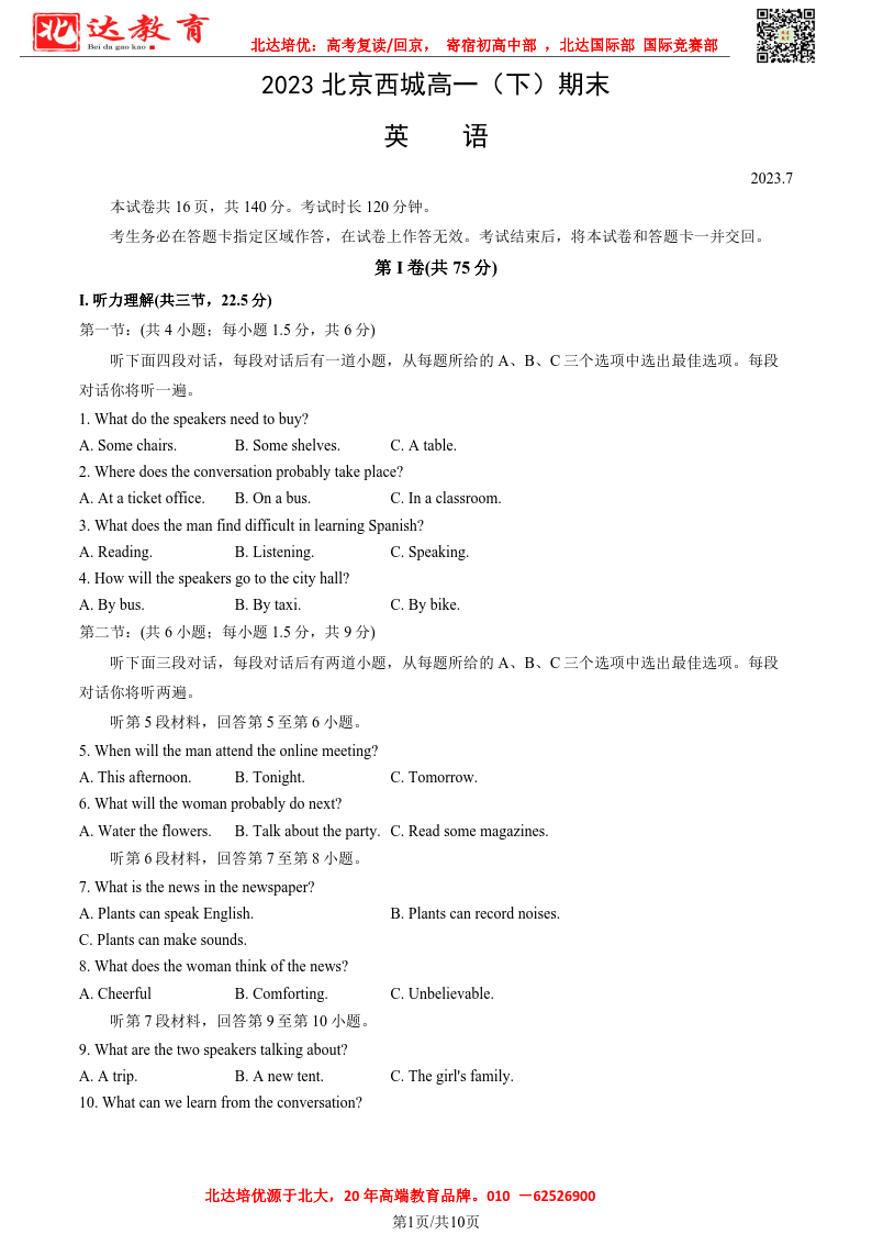 北京市2022-2023年高一下学期期末考试即将开考,为了帮助考生更好的核对考试答案,admw360复读学校整理了2022-2023学年北京西城区高一下学期期末英语试题及答案题,供考生参考。