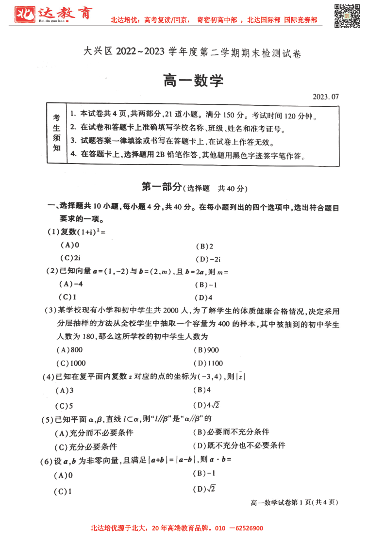 北京市2022-2023年高一下学期期末考试即将开考,为了帮助考生更好的核对考试答案,admw360复读学校整理了2022-2023学年北京大兴区高一下学期期末数学试题及答案,供考生参考。