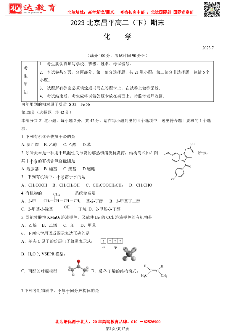 北京市2022-2023年高二下学期期末考试即将开考,为了帮助考生更好的核对考试答案,admw360复读学校整理了2022-2023学年北京昌平区高二下学期期末化学试题及答案,供考生参考。