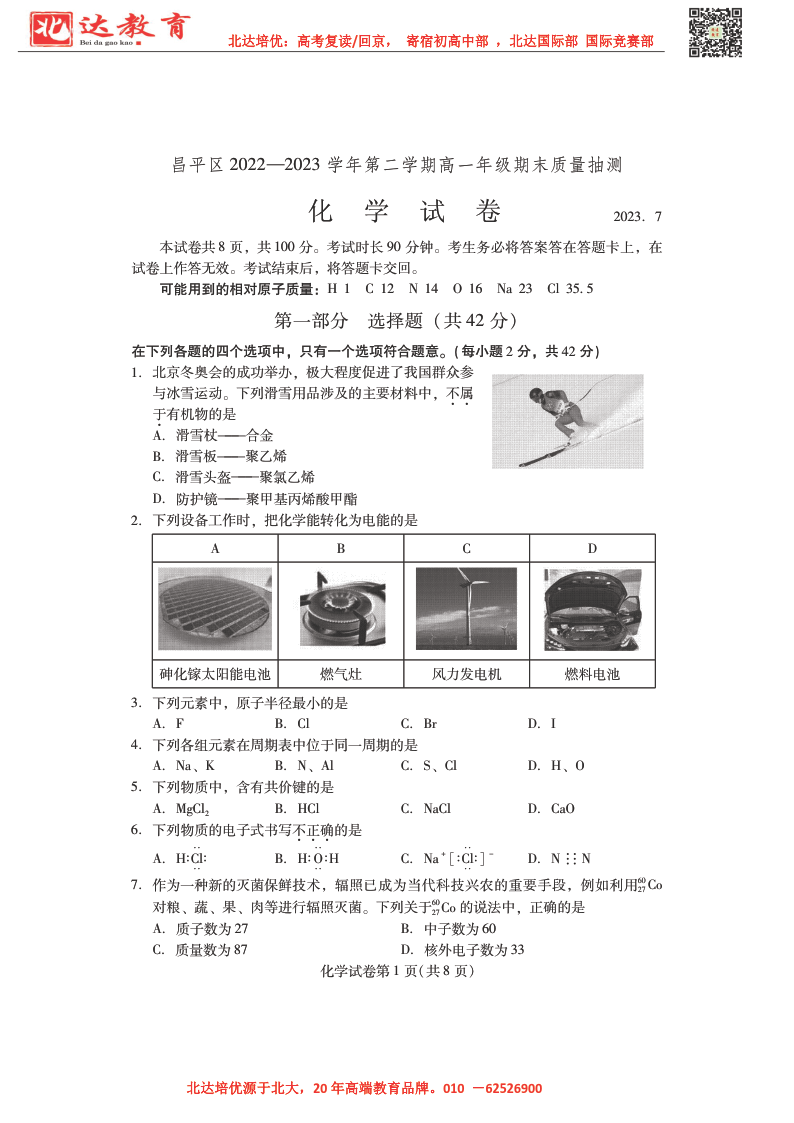 北京市2022-2023年高一下学期期末考试即将开考,为了帮助考生更好的核对考试答案,admw360复读学校整理了2022-2023学年北京昌平区高一下学期期末化学试题及答案,供考生参考。