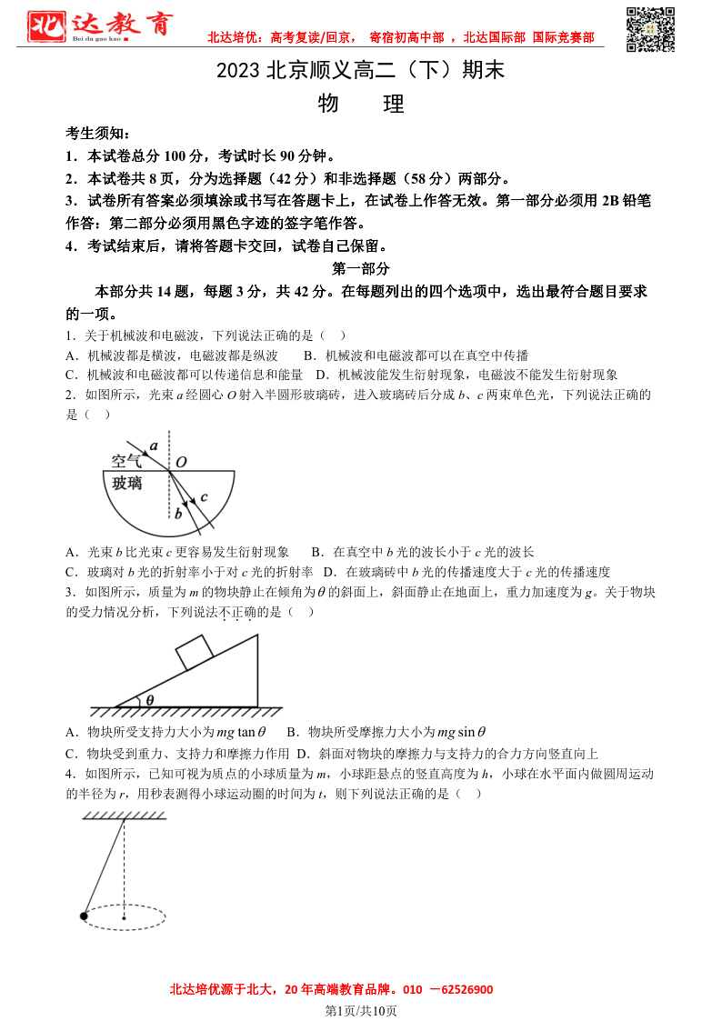 北京市2022-2023年高二下学期期末考试即将开考,为了帮助考生更好的核对考试答案,admw360复读学校整理了2022-2023学年北京顺义区高二下学期期末物理试题及答案,供考生参考。