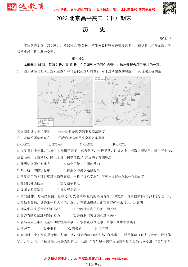 北京市2022-2023年高二下学期期末考试即将开考,为了帮助考生更好的核对考试答案,admw360复读学校整理了2022-2023学年北京昌平区高二下学期期末历史试题及答案,供考生参考。