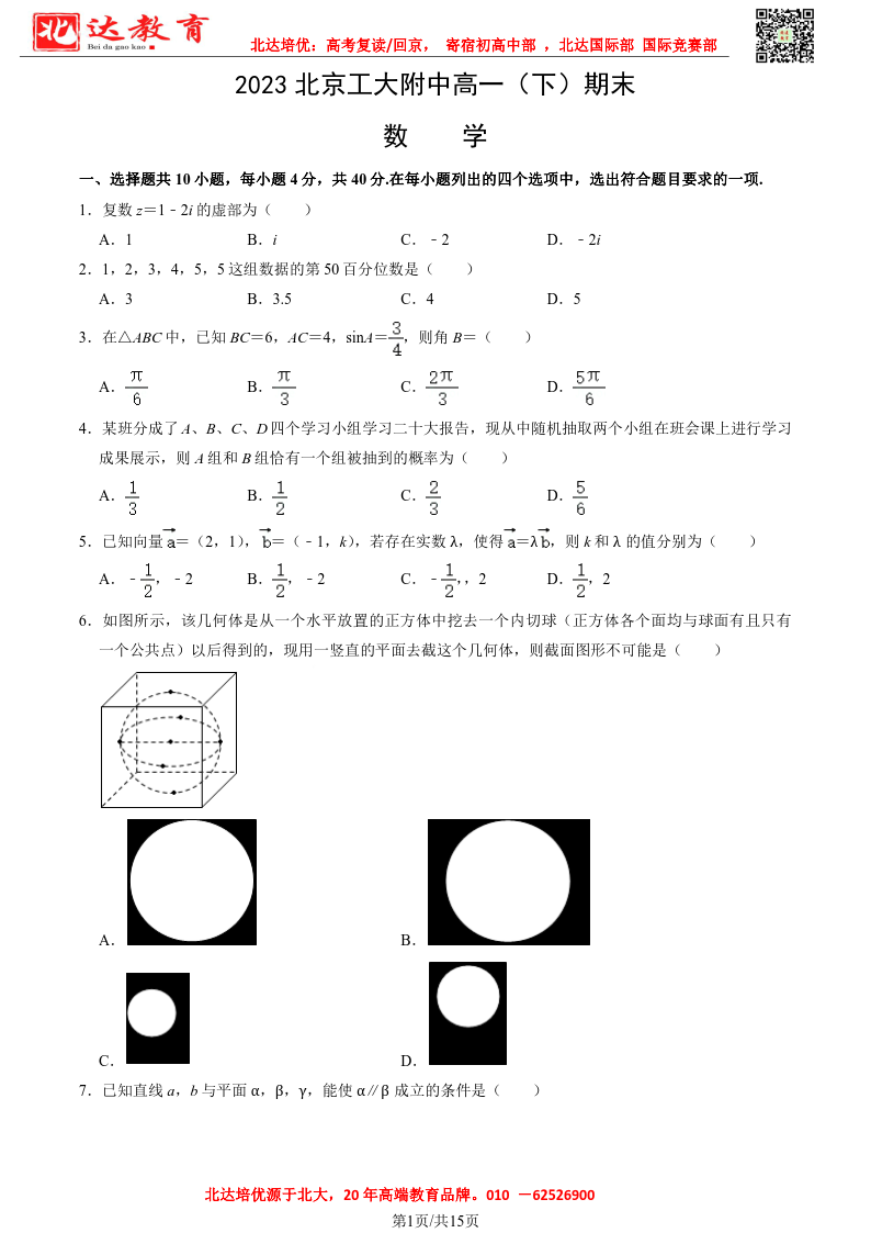 2022-2023学年北京各区高一下学期期末考试试题及答案汇总