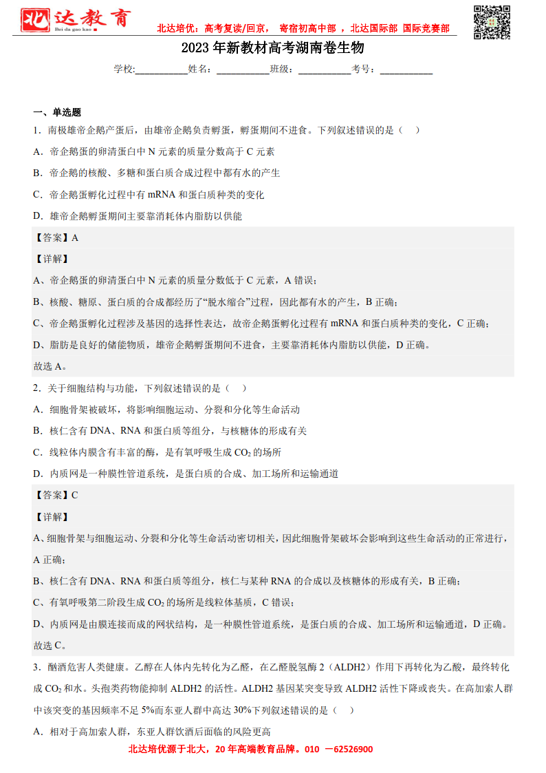2023全国高考考试已结束,为了方便同学们查找高考试题答案进行估分,admw360复读学校整理了2023年湖南高考生物试题及答案,分享给同学们。详情如下: