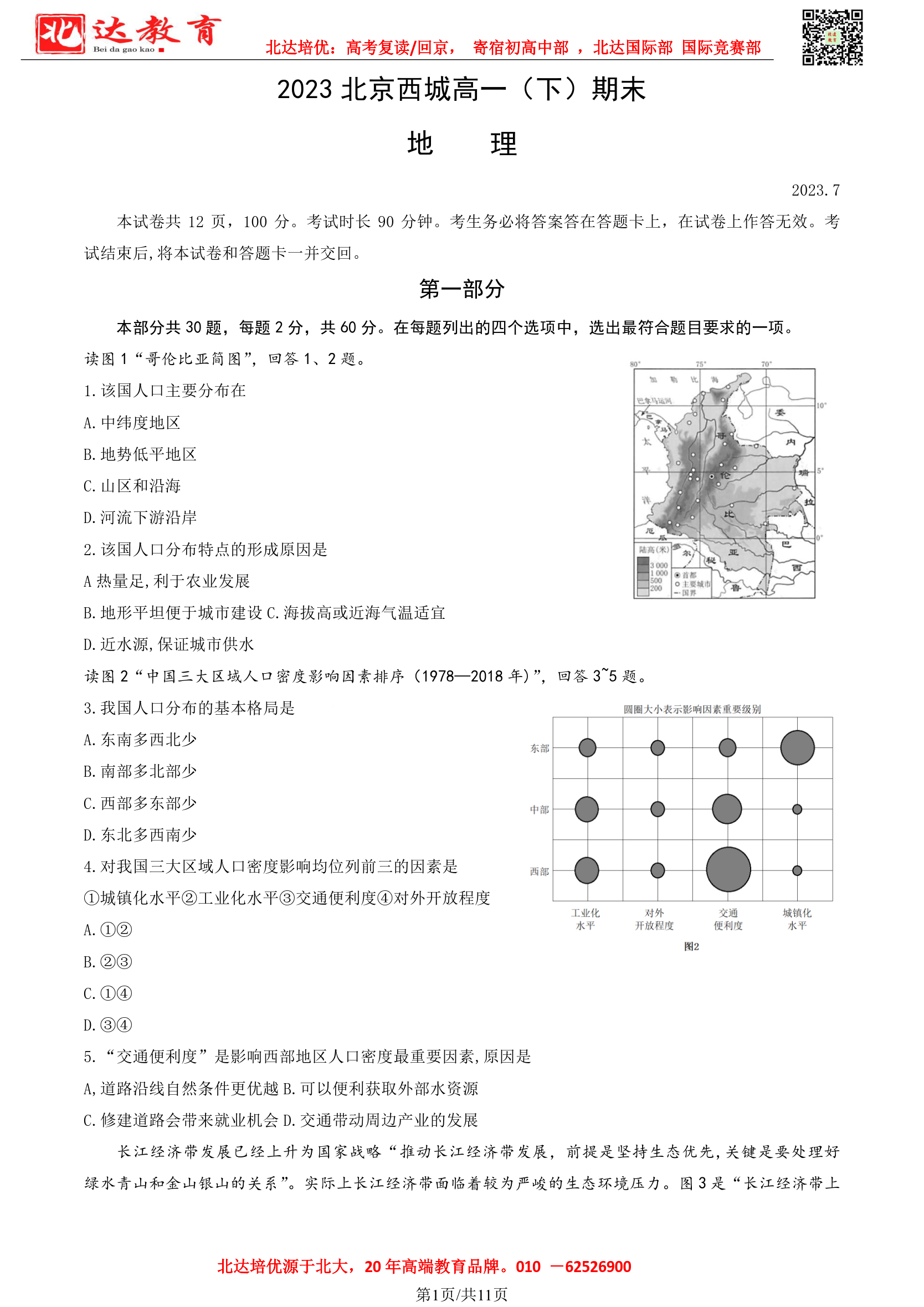 北京市2022-2023年高一下学期期末考试即将开考,为了帮助考生更好的核对考试答案,admw360复读学校整理了2022-2023学年北京西城高一(下)期末地理试题及答案,供考生参考。