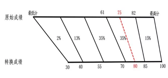 以上的5个等级及各等级对应的比例及赋分区间是事先设定的固定规则,转换后赋分成绩满分为100分,赋分起点为30分。