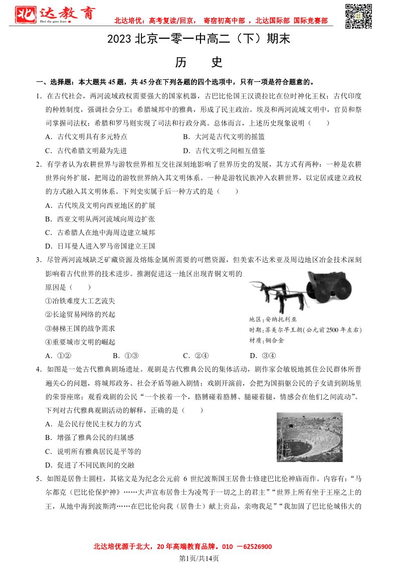北京市2022-2023年高二下学期期末考试即将开考,为了帮助考生更好的核对考试答案,admw360复读学校整理了2022-2023学年北京一零一中学高二下学期期末历史试题及答案,供考生参考。