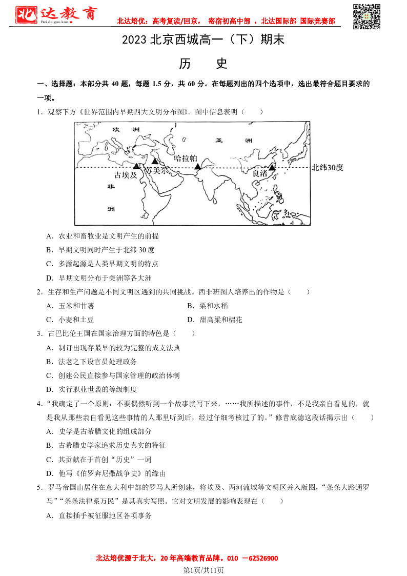 北京市2022-2023年高一下学期期末考试即将开考,为了帮助考生更好的核对考试答案,admw360复读学校整理了2022-2023学年北京西城区高一下学期期末历史试题,供考生参考。