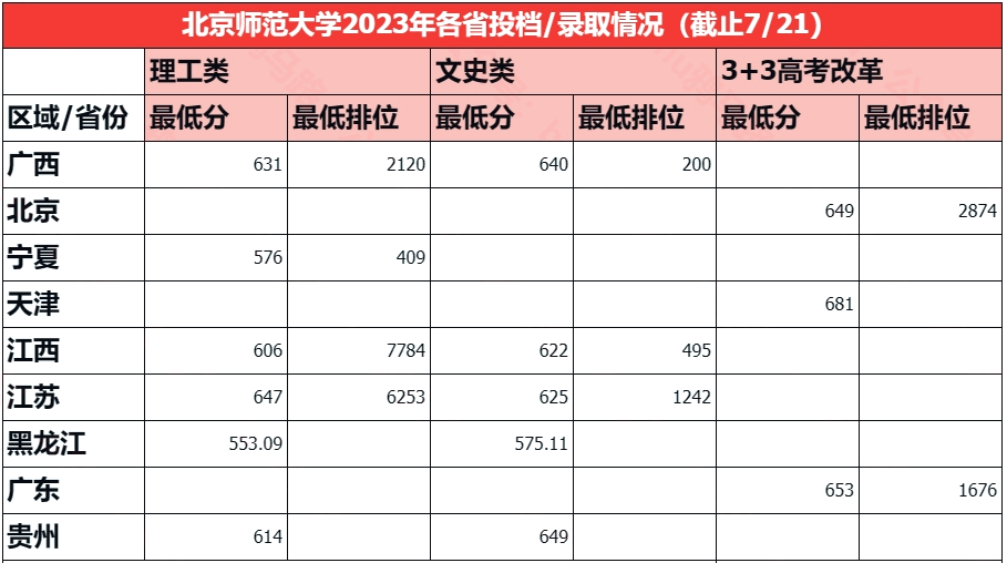 目前北京师范大学已公布这些地区的本科普通批次录取/投档结果:广西、北京、宁夏、天津、江西、江苏、黑龙江、广东、贵州。详情如下: