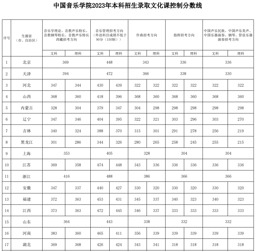 中国音乐学院2023年本科招生录取文化课控制分数线已公布,本文整理了相关数据,详情如下: