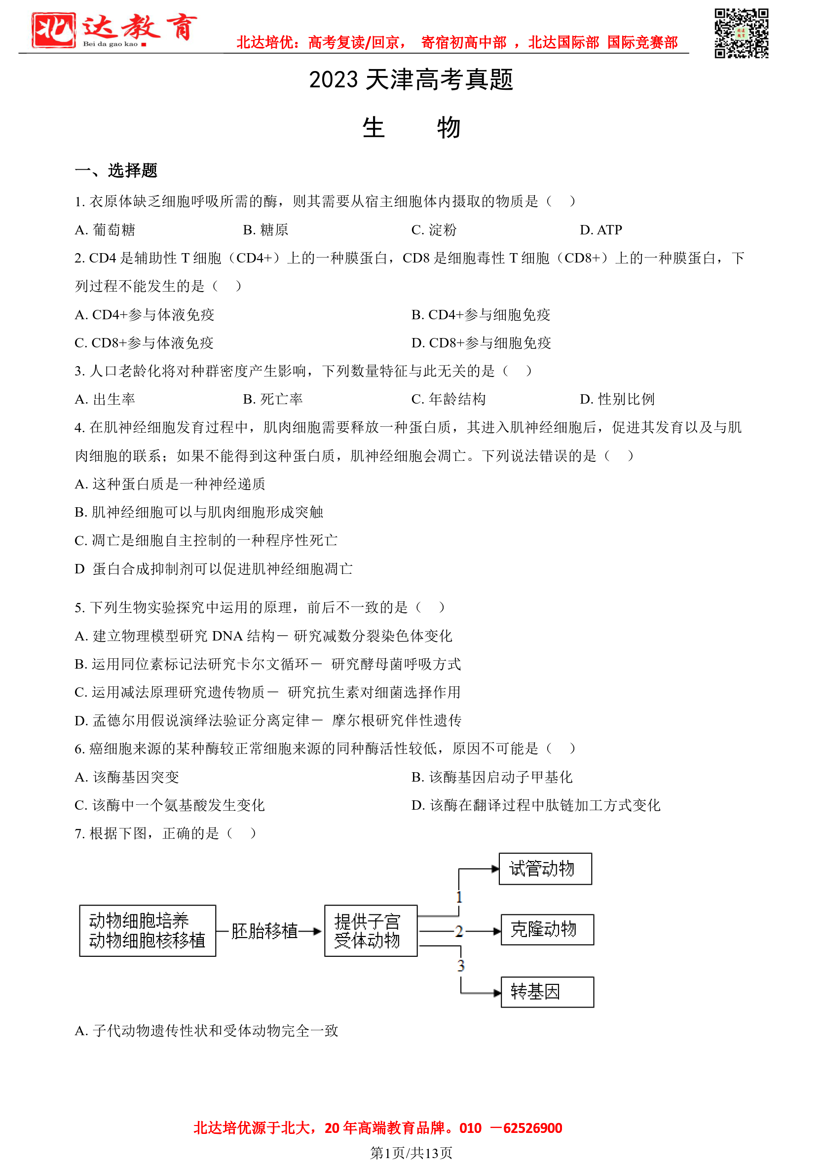 2023全国高考考试已结束,为了方便同学们查找高考试题答案进行估分,admw360复读学校整理了2023高考天津卷生物试题及答案,分享给同学们。详情如下: