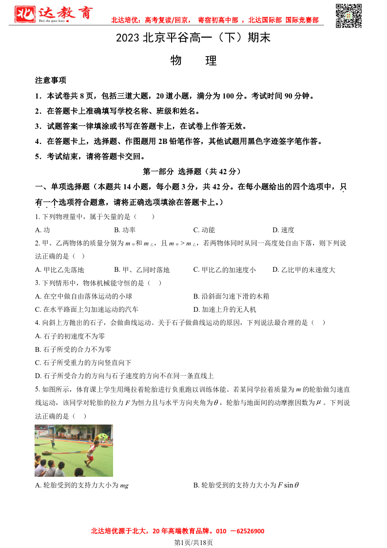 北京市2022-2023年高一下学期期末考试即将开考,为了帮助考生更好的核对考试答案,admw360复读学校整理了2022-2023学年北京平谷区高一下学期期末物理试题及答案,供考生参考。