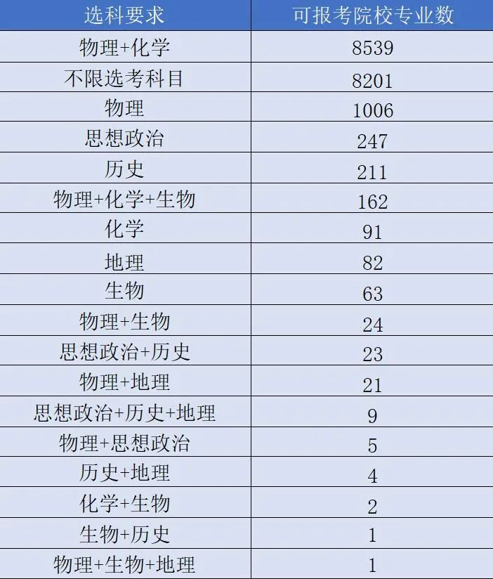 《2024版选科要求》为各高校本科专业提出了18种选科要求。其中,要求“物理+化学”的院校专业数量最多,共8539个;其次为“不限科目要求”,共8201个;排在第三的是必选物理,共1006个。
