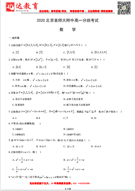 2020北京首师大附中高一分班考试数学