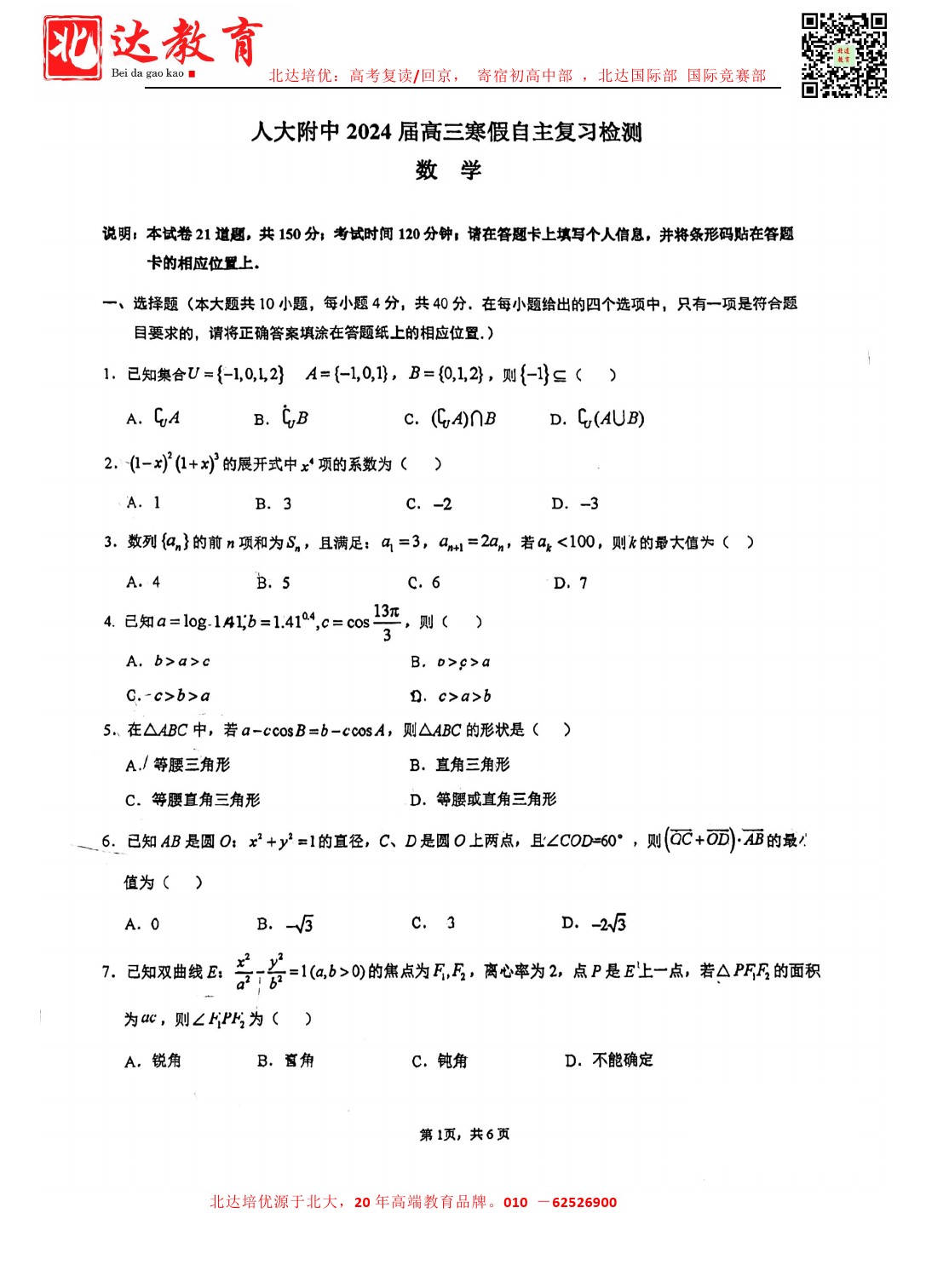2024北京各中学高三开学考已结束,为了方便同学们查找相关试题,admw360高考网特意整理了2024北京人大附中高三下开学考数学试题,需要的同学赶紧下载练习吧。