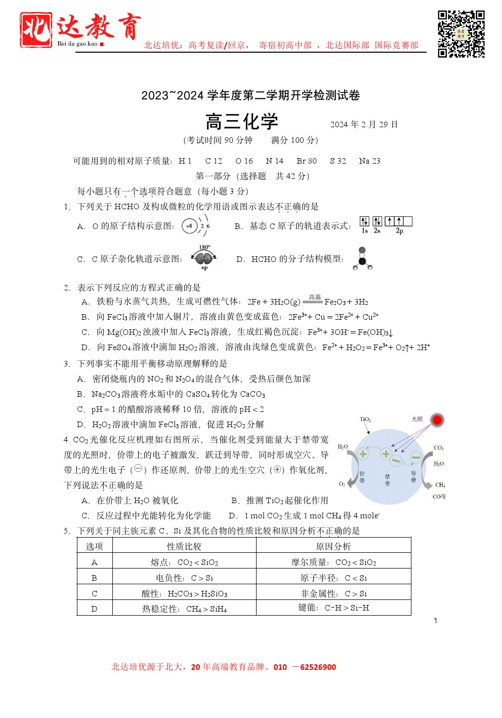 2024北京各中学高三开学考已结束,为了方便同学们查找相关试题,admw360高考网特意整理了2024北京清华附中朝阳学校高三下开学考化学试题及答案,需要的同学赶紧下载练习吧。