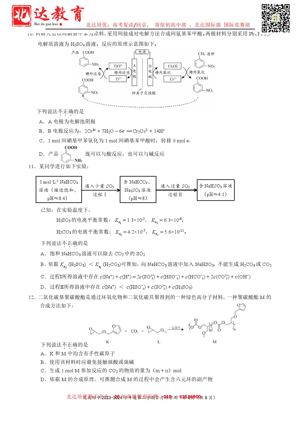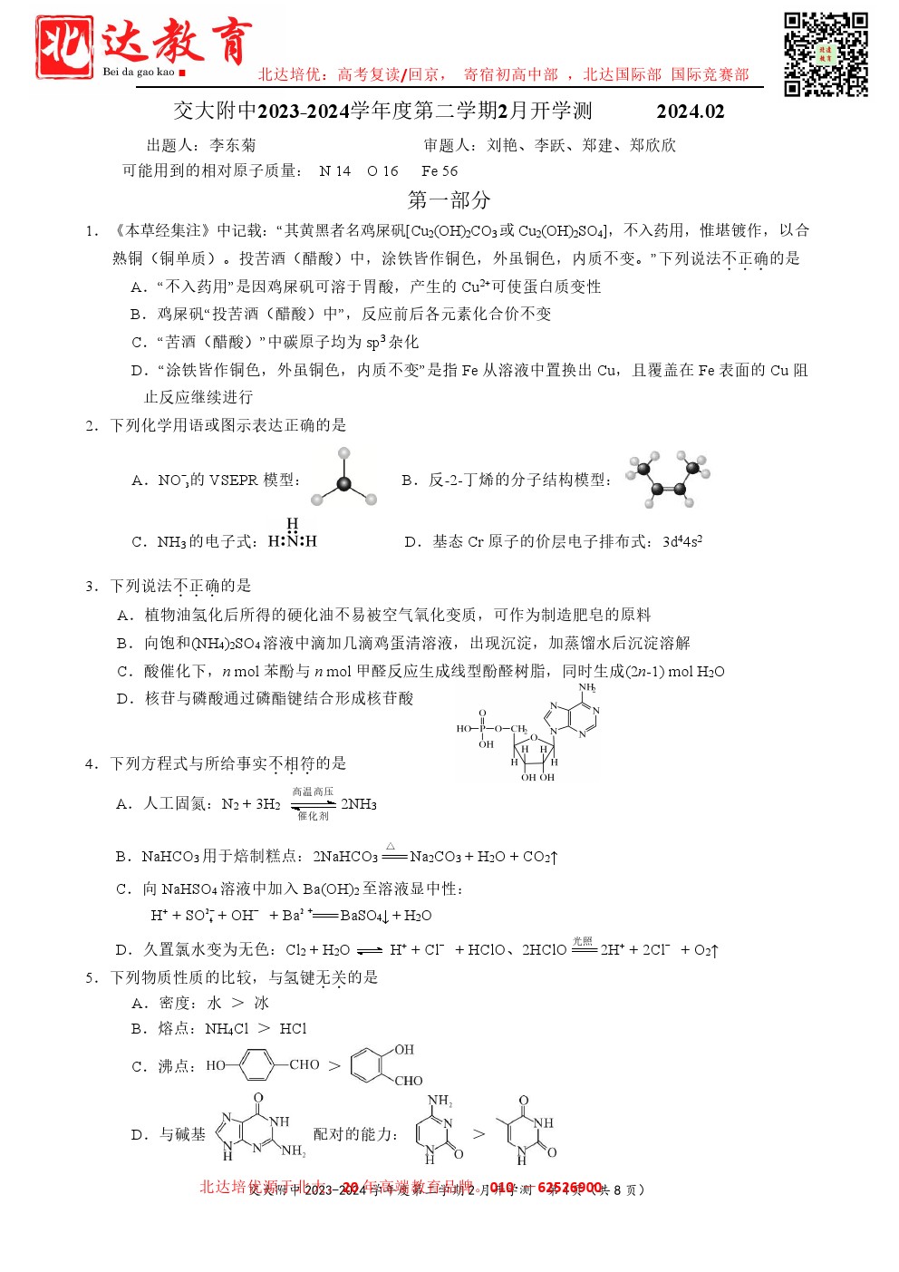 2024北京各中学高三开学考已结束,为了方便同学们查找相关试题,admw360高考网特意整理了2024北京交大附中高三下开学考化学试题及答案,需要的同学赶紧下载练习吧。