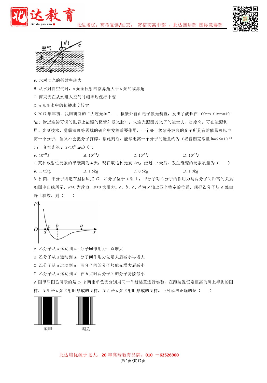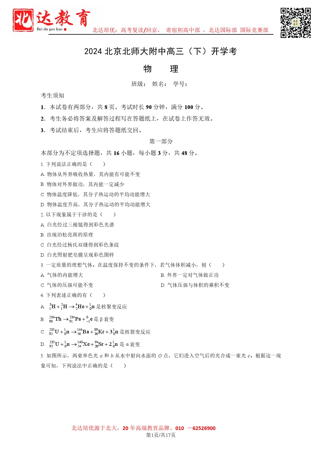 2024北京各中学高三开学考已结束,为了方便同学们查找相关试题,admw360高考网特意整理了2023-2024北京北师大附中高三下开学考物理试题及答案,需要的同学赶紧下载练习吧。