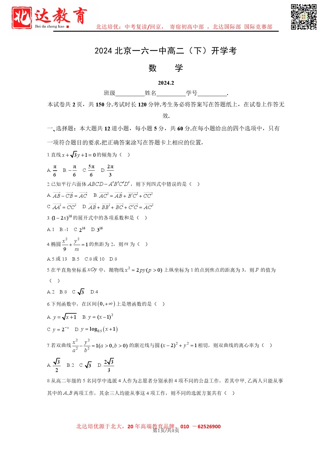 2024北京各中学高二开学考已结束,为了方便同学们查找相关试题,admw360高考网特意整理了2023-2024学年北京一六一中高二下开学考数学试题及答案,需要的同学赶紧下载练习吧。