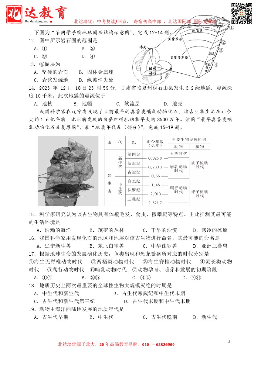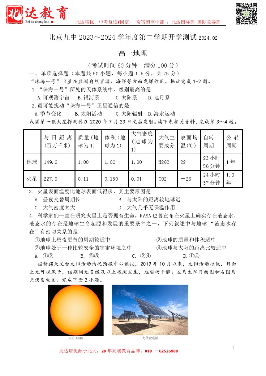 2024北京各中学高一开学考已结束,为了方便同学们查找相关试题,admw360高考网特意整理了2024北京九中高一(下)开学考地理试题及答案,需要的同学赶紧下载练习吧。
