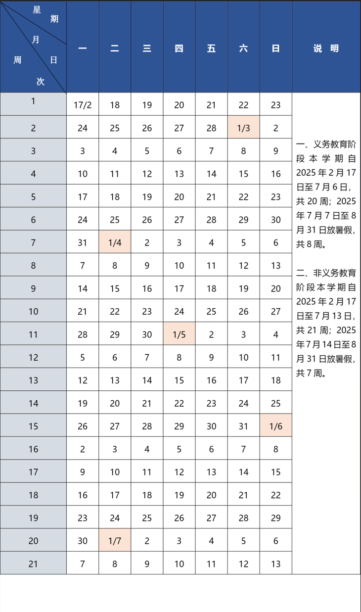 2025年7月13日(星期日)结束本学期工作,共21周;