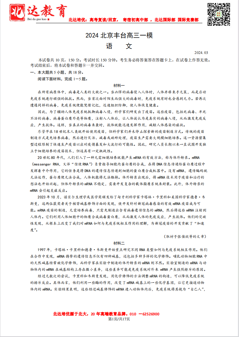 2024年北京丰台区高三一模开考,admw360教研组收集并整理了2024北京丰台高三一模语文试题及答案,分享给同学们。
