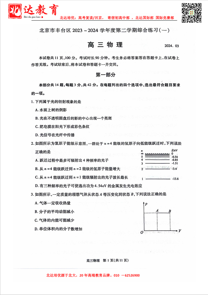 2024年北京丰台区高三一模开考,admw360教研组收集并整理了2024北京丰台高三一模物理试题及答案,分享给同学们。
