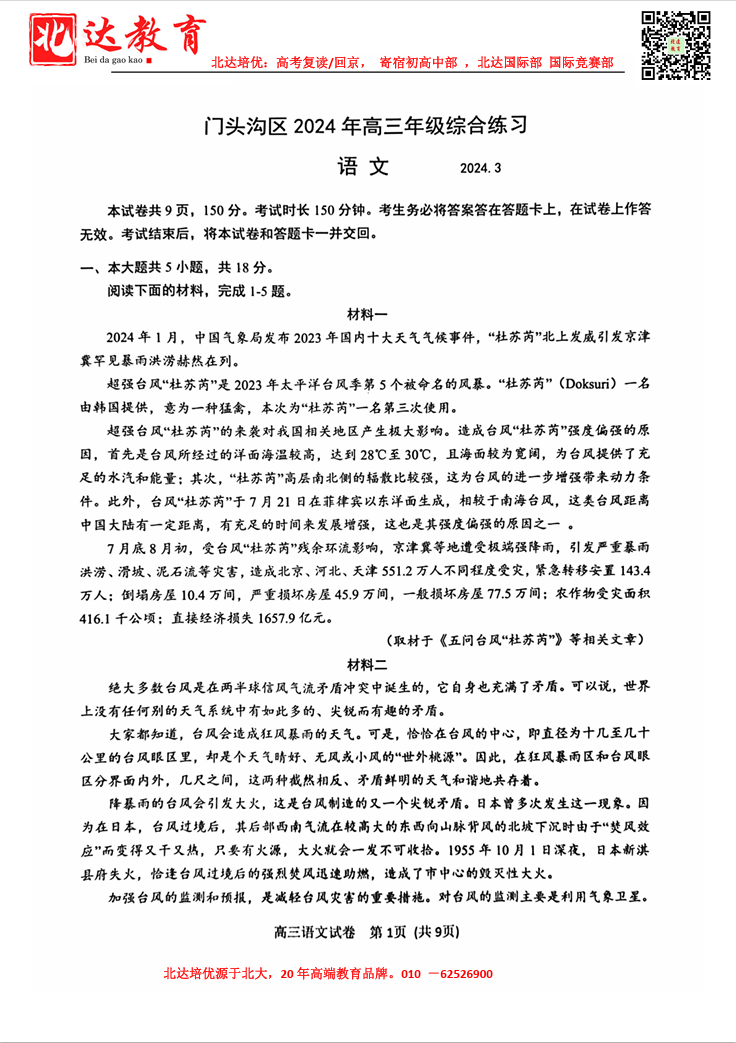 2024年北京门头沟高三一模开考,admw360教研组收集并整理了2024北京门头沟高三一模语文试题及答案,分享给同学们。