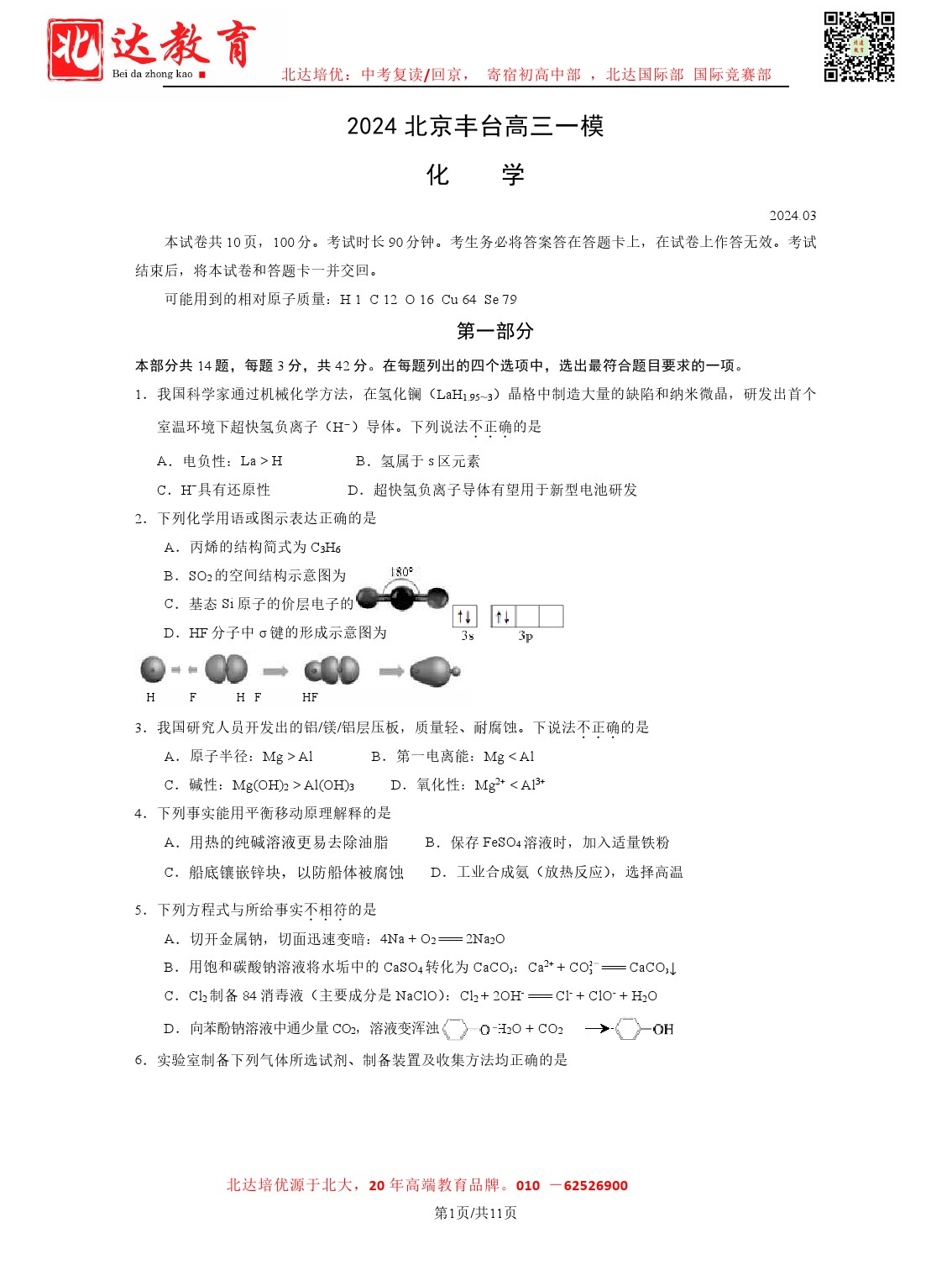 2024年北京丰台区高三一模开考,admw360教研组收集并整理了2024北京丰台区高三一模化学试题及答案,分享给同学们。