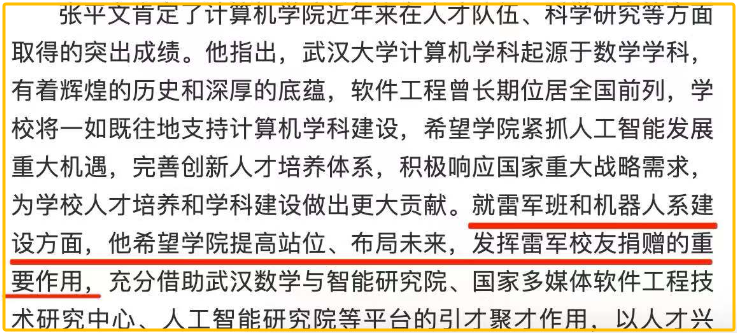 3月25日,武汉大学官网对校长张平文调研计算机学院进行了报道,文章提到:“就雷军班和机器人系建设方面,张平文希望学院提高站位、布局未来,发挥雷军校友捐赠的重要作用,凝心聚力早日把计算机学院建成国内知名、世界一流的学术高地。”雷军班是个什么情况,跟企业家雷军有什么关系?