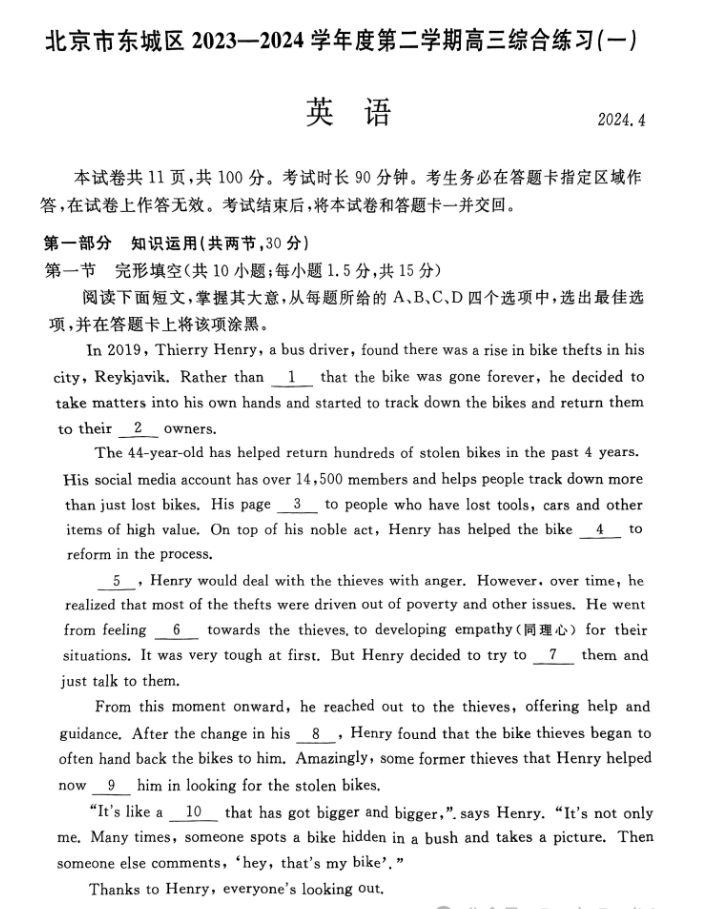 2024年北京东城区高三一模4月7日开考,admw360教研组收集并整理了2024北京东城区高三一模英语试卷及答案,分享给同学们。
