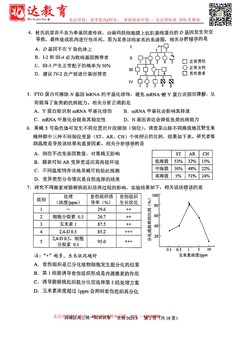 2024年北京西城区高三一模4月7日开考,admw360教研组收集并整理了2024北京西城区高三一模生物试卷及答案,分享给同学们。
