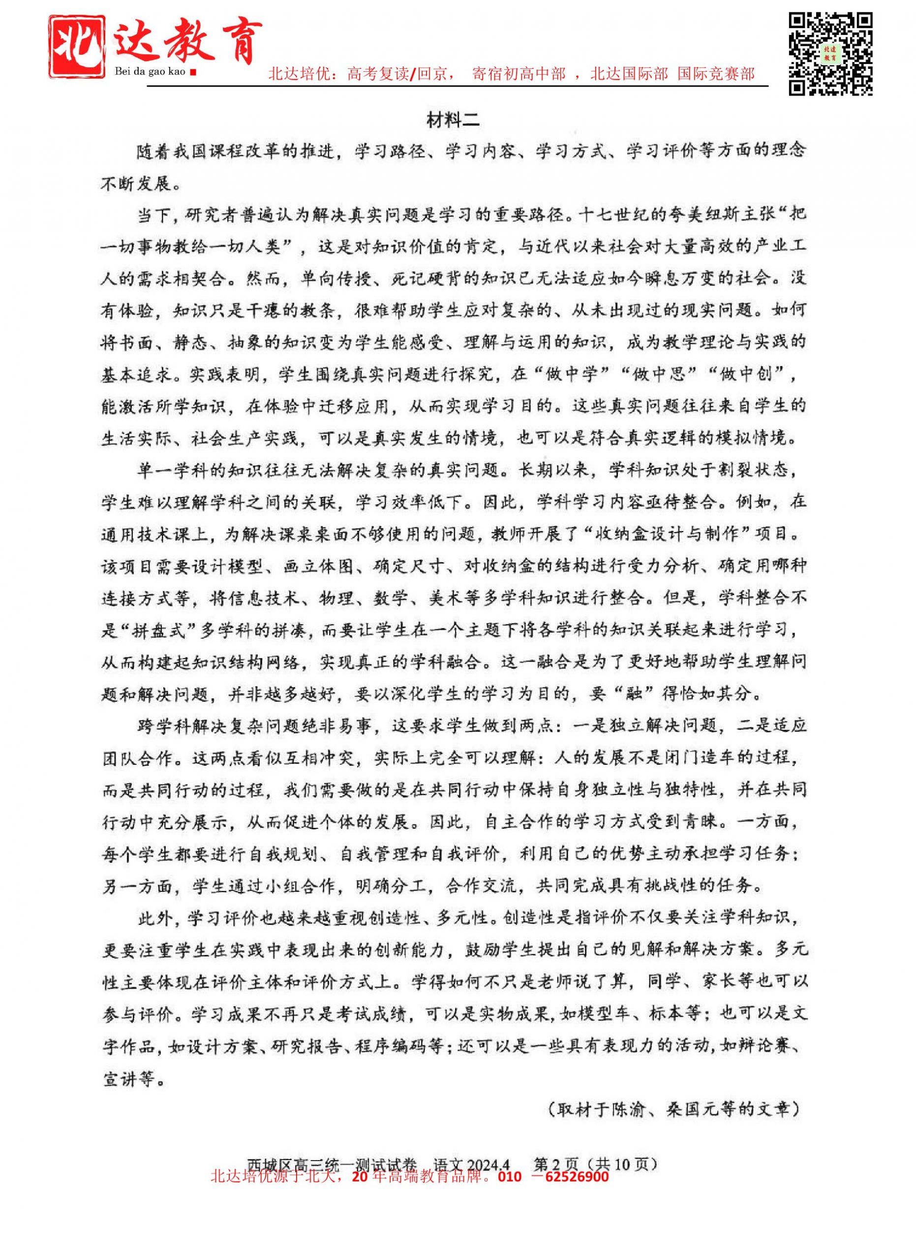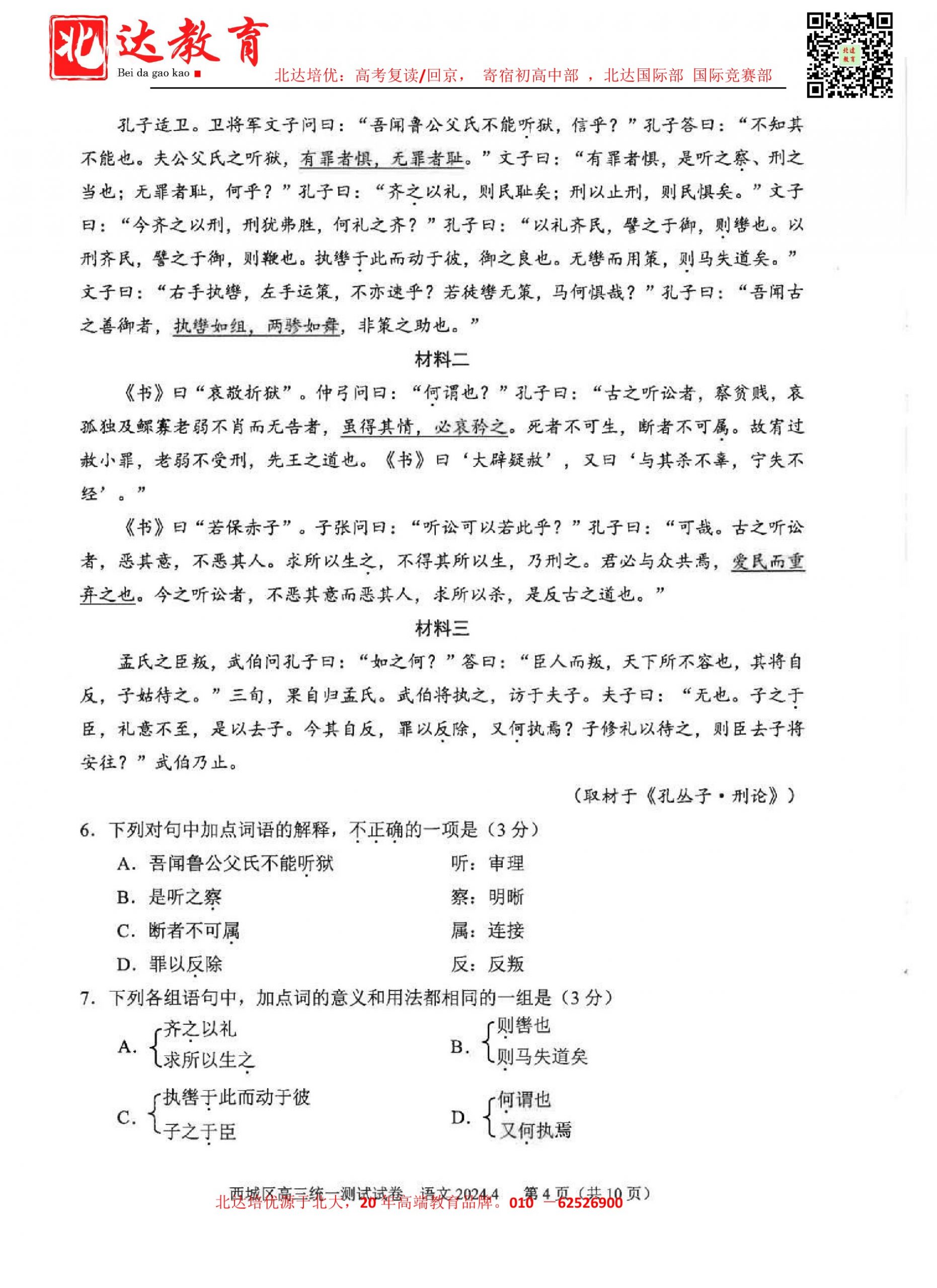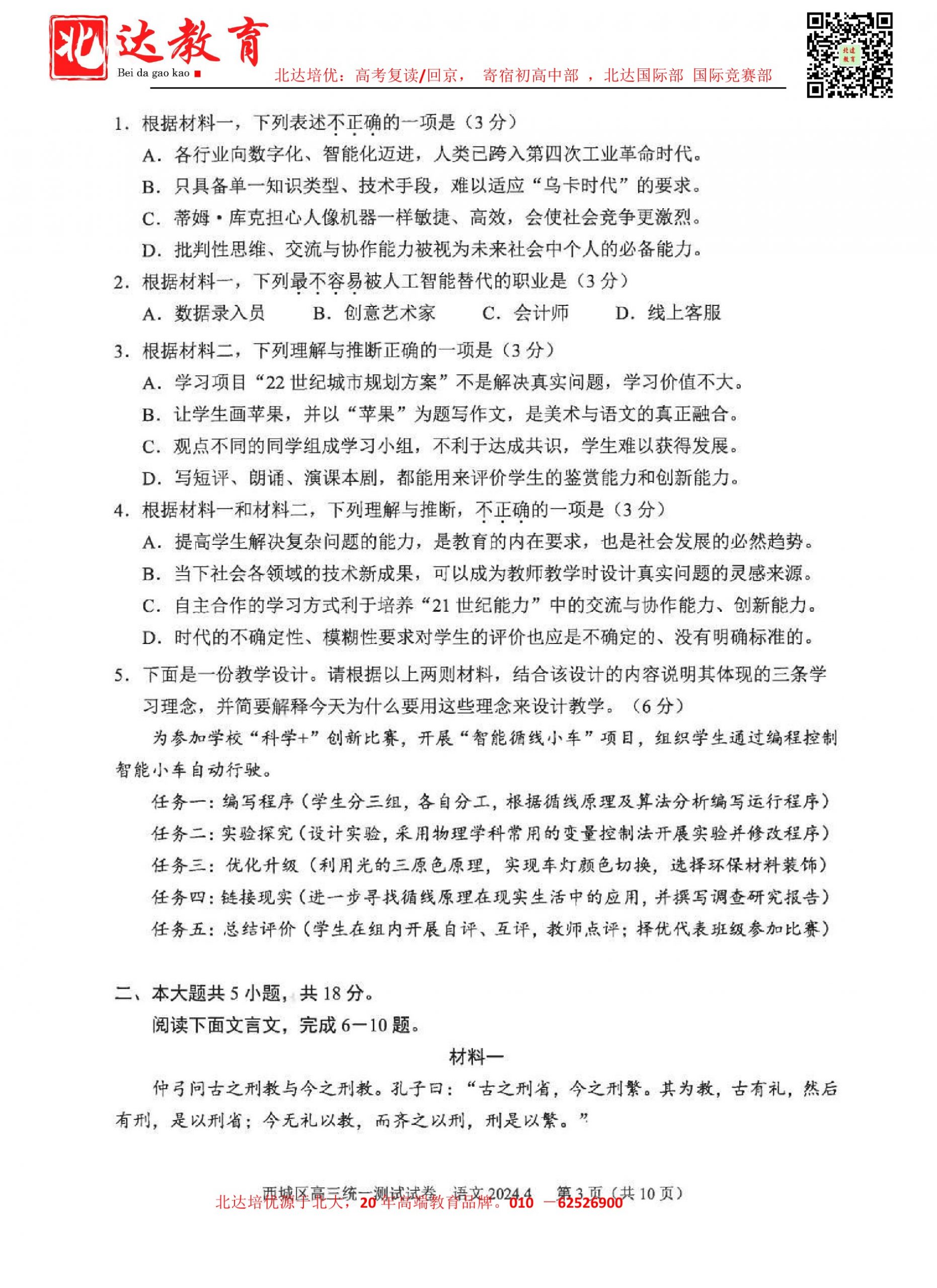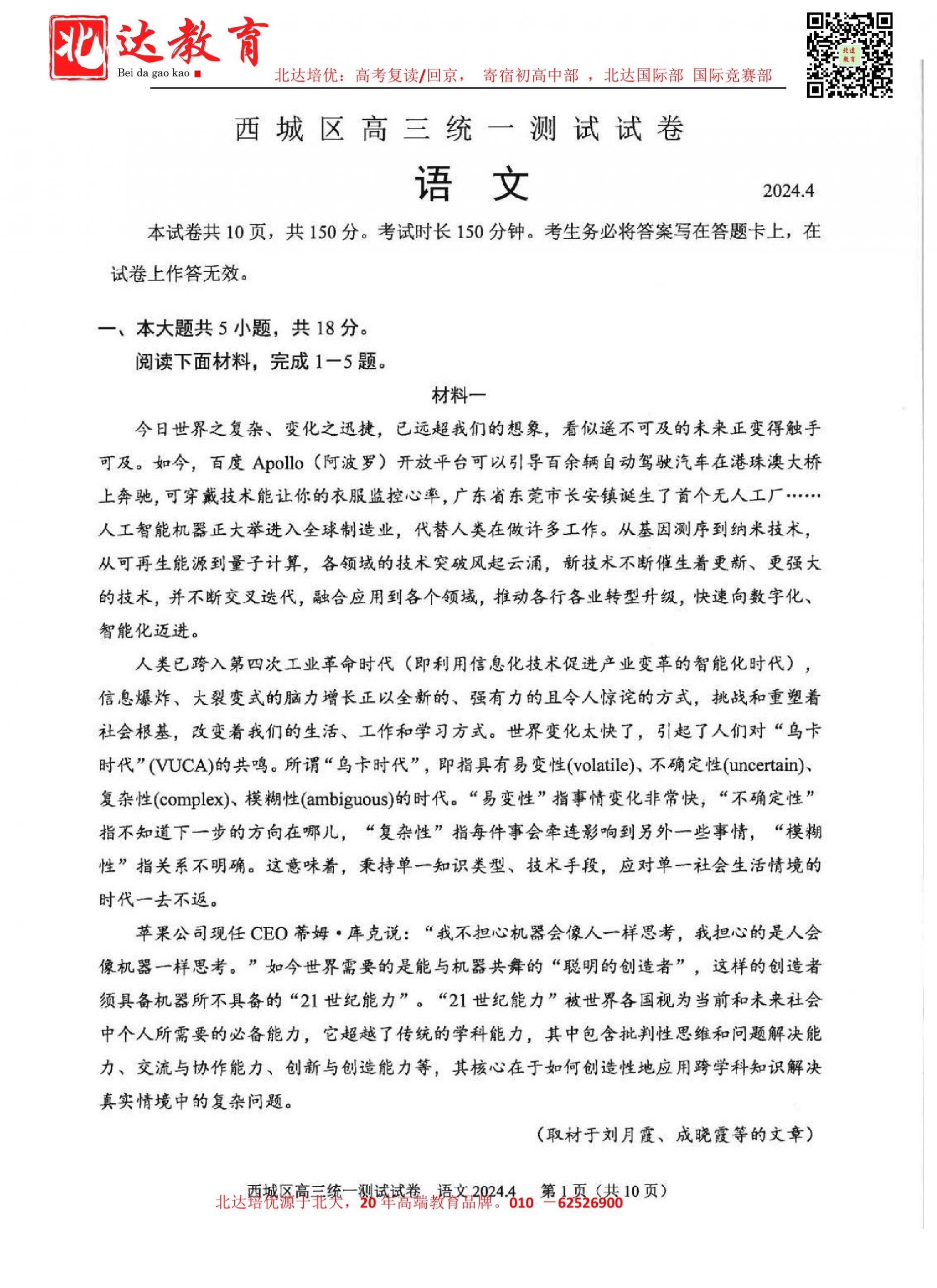 2024年北京西城区高三一模4月7日开考,admw360教研组收集并整理了2024北京西城区高三一模语文试卷及答案,分享给同学们。
