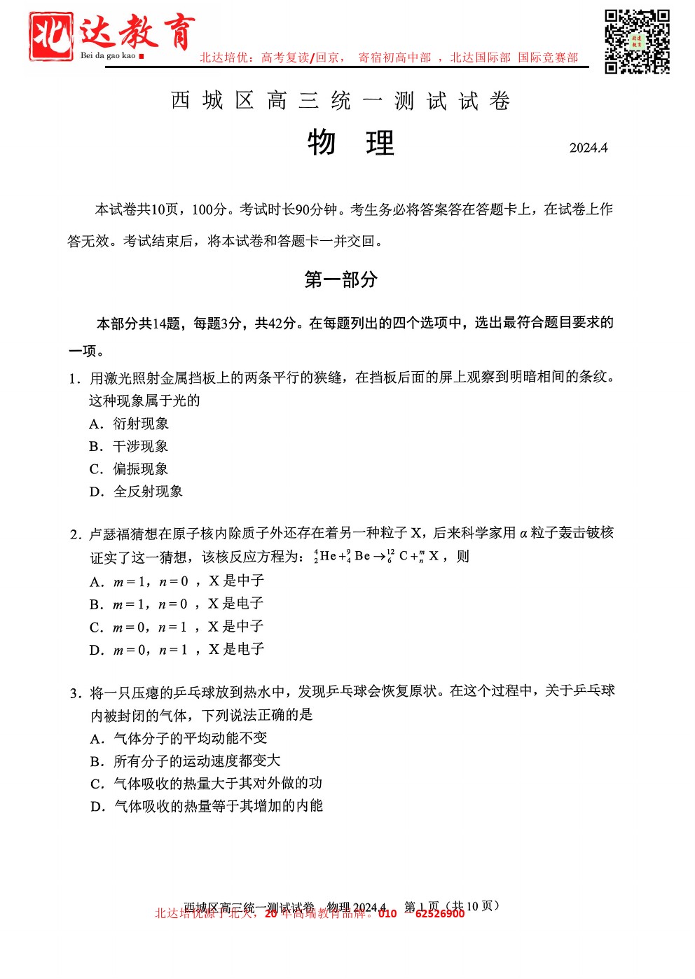 2024年北京西城区高三一模4月7日开考,admw360教研组收集并整理了2024北京西城区高三一模物理试卷及答案,分享给同学们。