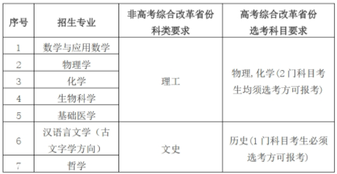 为突出基础学科在国家关键领域的支撑引领作用,同时聚焦国家人才紧缺的人文社会科学领域,我校强基计划招生专业设置如下:数学与应用数学、物理学、化学、生物科学、基础医学﹑汉语言文学(古文字学方向)﹑哲学。
