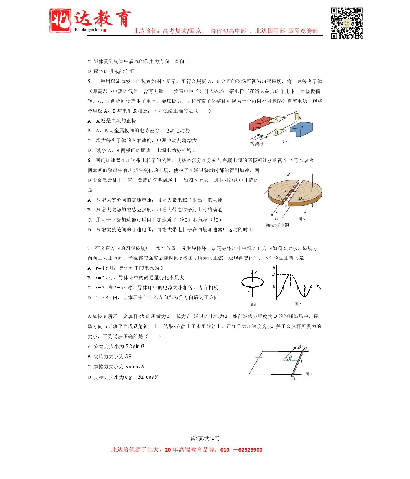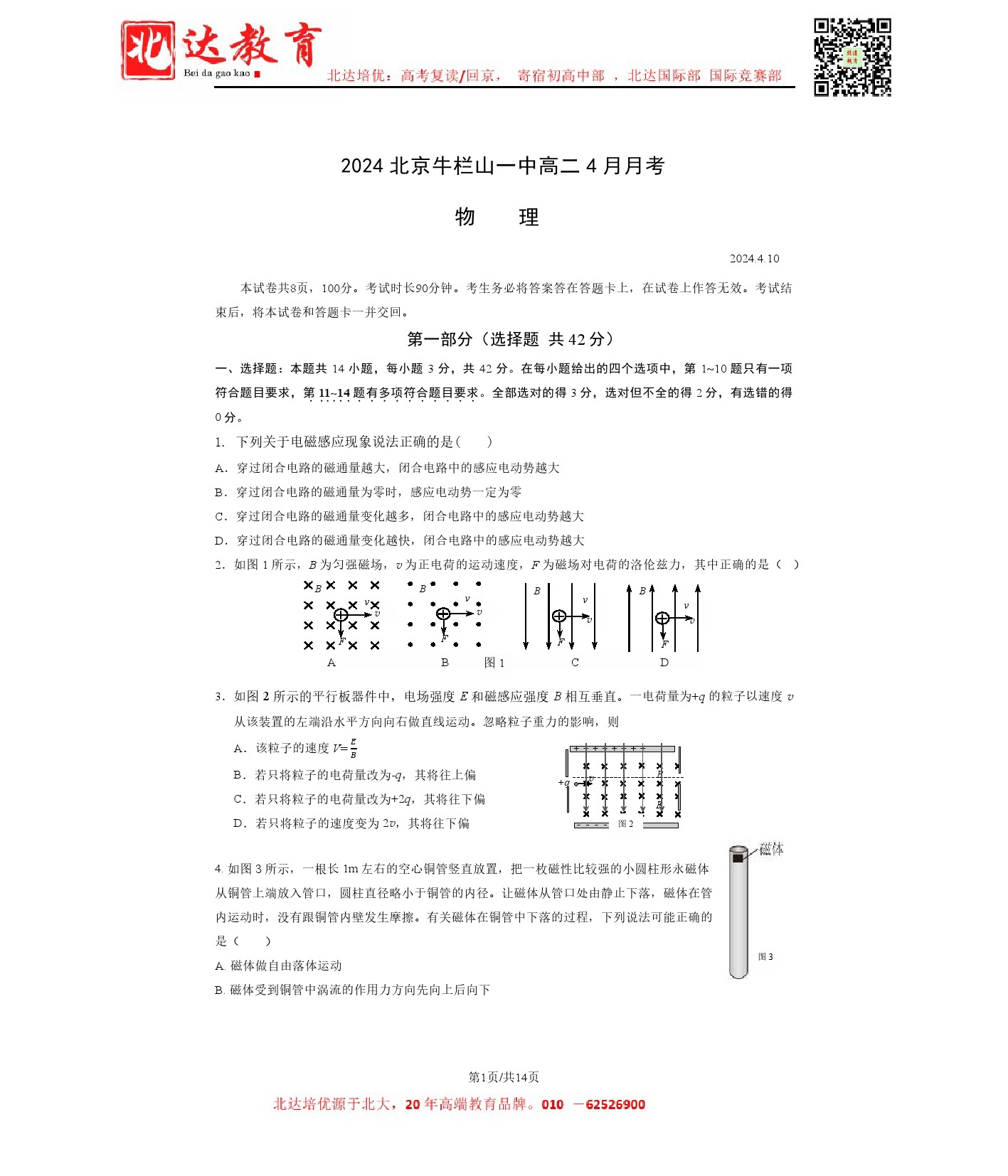 2024年北京各高中高二进行了4月月考测试,admw360教研组收集并整理了2024北京牛栏山一中高二4月月考物理试卷及答案,分享给同学们。