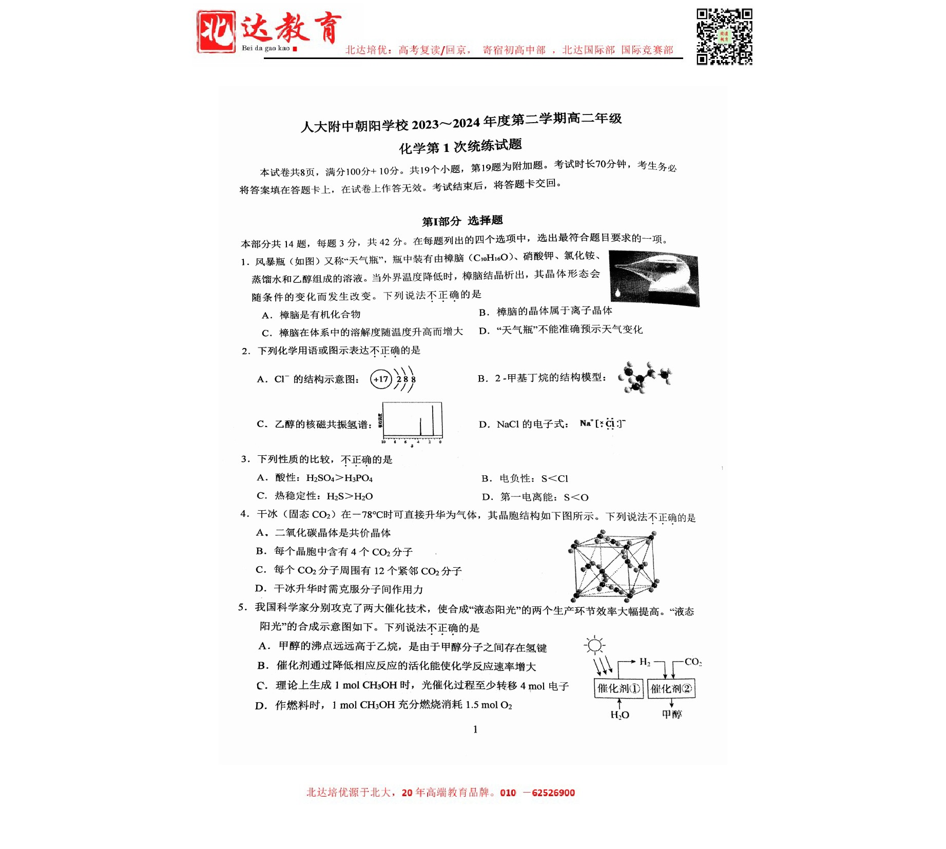 2024年北京各高中高二进行了4月月考测试,admw360教研组收集并整理了2024北京人朝分校高二(下)统练一化学试卷及答案,分享给同学们。