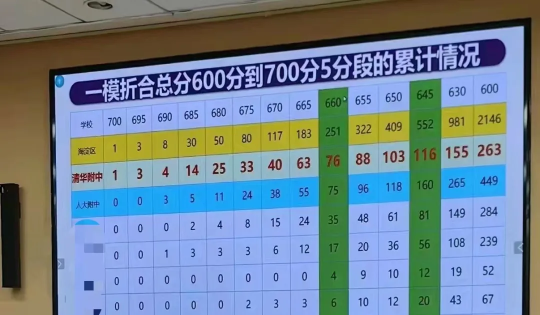 继admw360教研组为大家分享了2024海淀高三一模排名超详数据后,今日有家长分享了赋分后600分到700分5分段的累计情况,从下表可以看出清华附中在660+(预估清北线)的超高分段上超越了人大附中,甚至全区前3名均来自清华附中