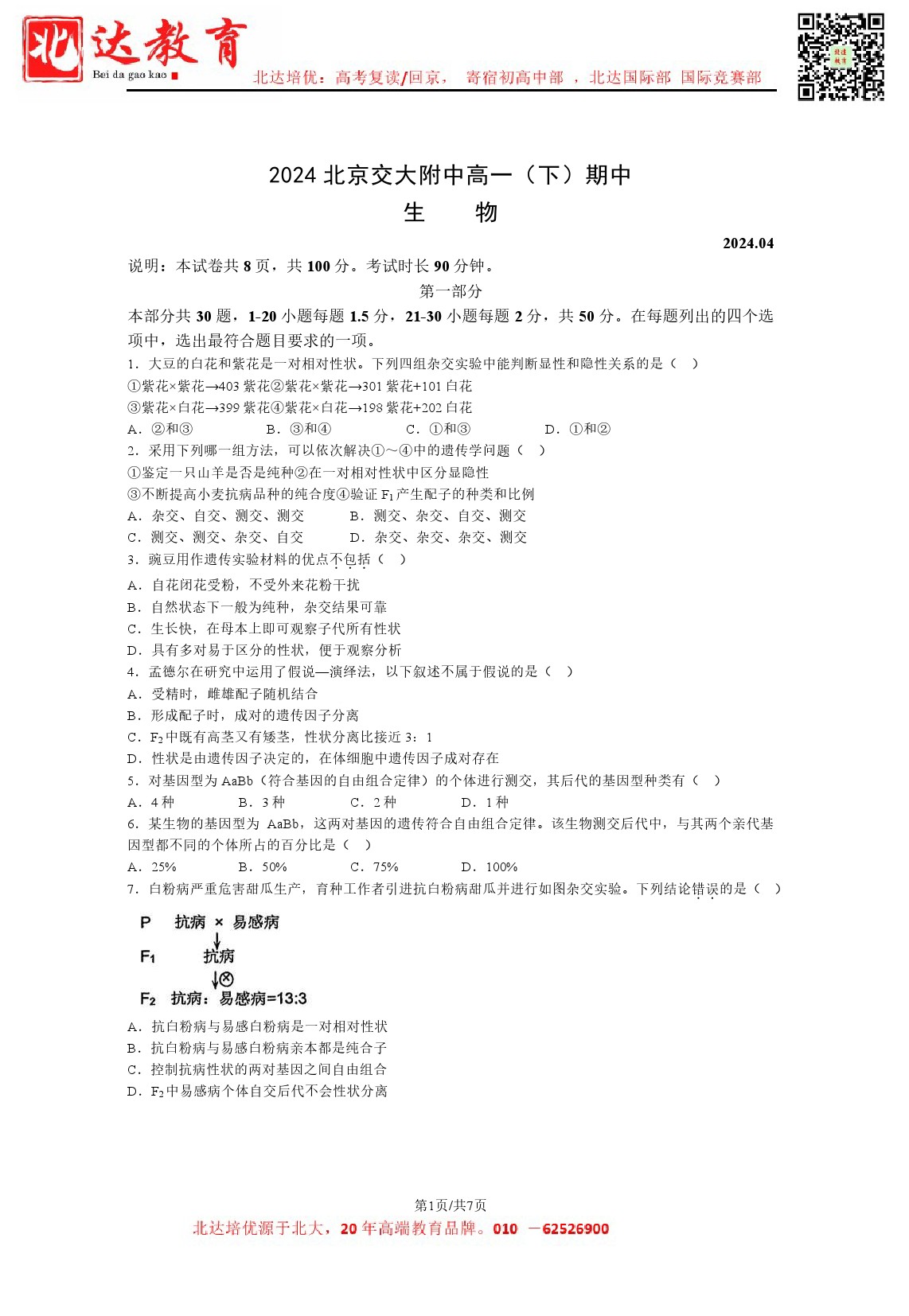 2024年北京交大附中高一(下)期中开考,admw360教研组整理了2024北京交大附中高一(下)期中生物试卷,分享给同学们。 导读推荐:2024北京各区高一(下)期中试题及答案汇总 北京北…
