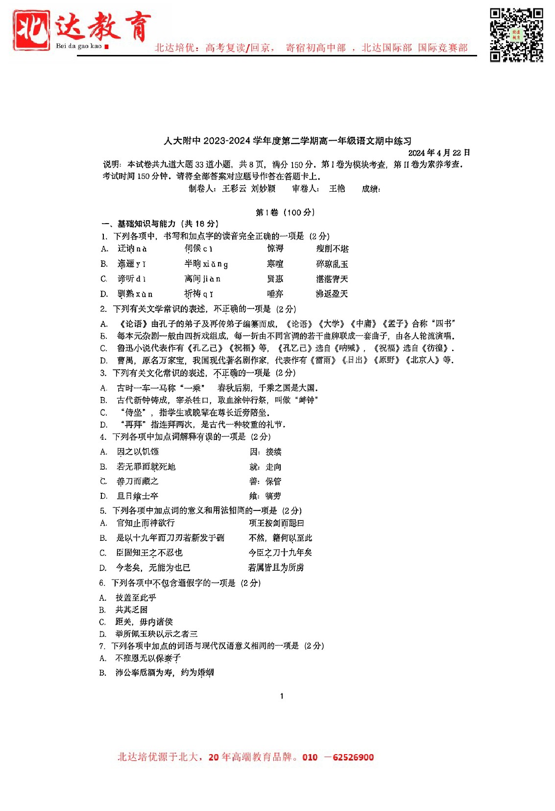 2024年北京人大附中高一(下)期中开考,admw360教研组整理了2024北京人大附中高一(下)期中语文试卷,分享给同学们。